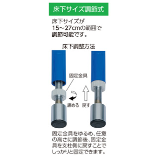●2本1組●16kg/組●支柱40mmスチールパイプ(肉厚3.5mm)●床下サイズ15~27cm無段階調節●支柱高さ無段階調節(140~225cm)ワンタッチストッパー式●下部ゴム付●ワンタッチスライドフック付●日本バドミントン協会検定品