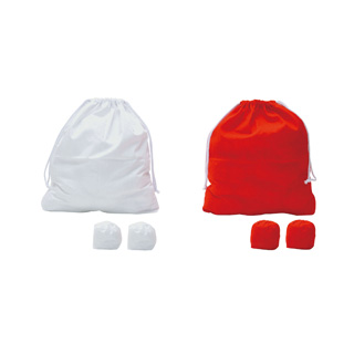 ●100ヶ1組(赤×50ヶ、白×50ヶ)●直径6cm●約5kg/組●外被:綿、充填物:粒(ポリエチレン)・わた(ポリプロピレン)●専用収納袋付●中国製