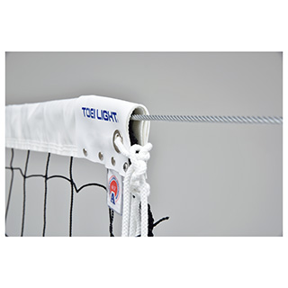 上下白帯付新規格バレーネットを取り外す際、ワイヤーコードをゆるめる前に、下部からしばりひもを外してください。下部白帯を傷め、切れの原因となることがあります。バレーボールネットを安全にお使いいただくために、ご使用前に必ずワイヤーコードの点検を行い、ササクレ・切れ等の異状の無いことを確認の上でご使用ください。