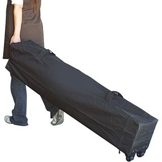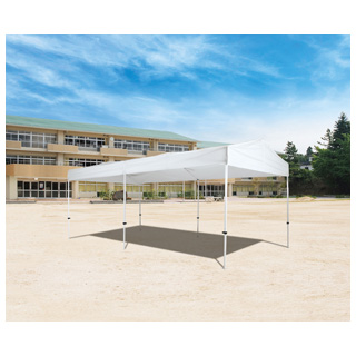 ●2.7×5.4m、高さ5段階調節(頂点部238・246・254・262・270cm、垂幕部170・178・186・194・202cm)、収納サイズ35×26×155cm●34kg●スチール脚28×23mm角、天幕部ポリエステル防水性・250D厚●UVカット率99%●杭(25cm)×6本・ローラーキャリーバッグ付●中国製