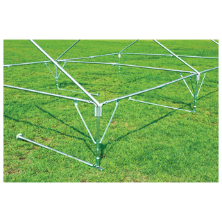 中折れ支柱タイプ 筋交いより下で支柱が折れるため、伏せた状態で筋交いの固定が出来る=桁パイプを持って立上げ可能、天幕の取付が簡単に行えます。
