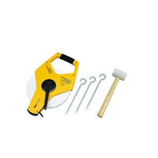 ●幅12.5mm×厚さ0.47mm×長さ100m●2800g●テープ:グラスファイバー(PVCコーティング)、ケース:ABS●2mm目盛●JIS1級●付属品:図解式球技場説明書、杭、ハンマー、収納ケース