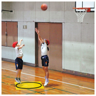 ゴール下近くに2枚のシートを敷き、そこから相手にじゃまされずにフリーでシュートが狙えます。 バスケットボール等ボール運動の導入ゲームとしてオススメです。